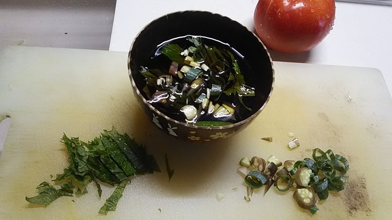 そうめんと胡麻の葉の醤油漬けと、お手製サルチパパ。ドラッグストアで二袋¥138本体の日本ハム製ウインナー使用。